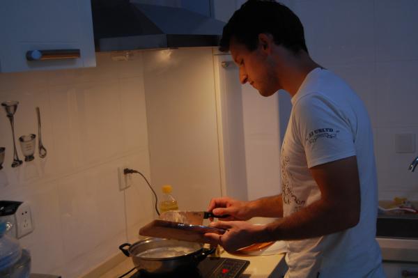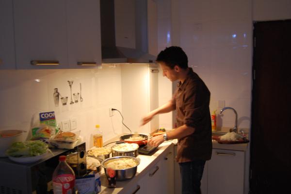 Da ich aus der Schaar der Austauschstudenten anscheinend derjenige war, der zuerst Geburtstag in China hat, musste das natürlich gebührend gefeiert werden. Julian und ich haben also am 25.9. eine Wohnungseinweihungsparty geschmissen, die sich um Mitternacht zu meiner Geburtstagsparty gewandelt hat. Wir hatten uns als ehrgeiziges Ziel gesetzt, für alle zu kochen, und zwar deutsches Essen!! Zuerst haben wir uns dazu auf "Schnitzeljagd" begeben, da aber weder Metro (ja, gibt es hier!) noch der Carrefour vernünftiges Schnitzelfleisch hatten, sind wir spontan auf Käsespätzle umgestiegen. Nun hat man ja in China nicht unbedingt die notwendigen Materialien (Käse, Spätzlepresse) zur Hand, also mussten wir für geschätzte 25 Leute (im Endeffekt waren über 30 da) Spätzle schaben: eine Herkulesaufgabe!