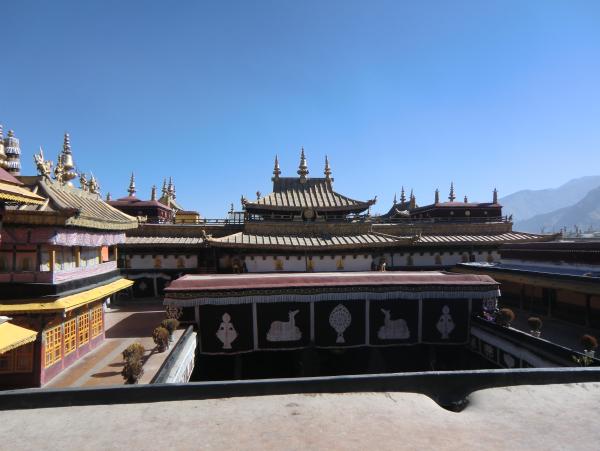 Die Regierung wird den Potala wohl in der nahen Zukunft (evtl. schon innerhalb des nächsten Jahres) für den Tourismus schließen und in den an seinem Fuße liegenden Verwaltungsgebäuden Nachbauten der zahlreichen Kapellen und Zimmer der verschiedenen Dalai-Lamas erstellen. Der Grund dafür durfte sein, dass das alte Gebäude dem Touristenandrang wohl nicht allzu gut standhält. Das goldene Dach des Potala ist für Touristen schon nicht mehr zugänglich. Ich war jedenfalls froh, dass ich es noch im Original sehen konnte, allerdings durften keine Bilder gemacht werden (wie in fast allen heiligen Gebäuden in Tibet) also kann ich nur erzählen: Die Atmosphäre in diesen alten buddhistischen Heiligtümern ist schon irgendwie besonders. Alles ist vorwiegend in rot und gelb gehalten (heilige Farben), es gibt Wandgemälde mit Göttern, Protektoren usw. und viele Teppiche. Ausserdem werden vor allen wichtigen Statuen Opferbecken aufgestellt, die mit Butter (oder pflanzlichen Ölen) gefüllt sind. Diese Fette brennen über in die Becken gesteckte Dochte kontinuierlich nieder. Jeder buddhistische Pilger gibt dort etwas Butter hinzu, denn wenn ein Opferbecken leer ist, bedeutet das Unglück, weil die Götter die Menschen dann nicht mehr sehen können.