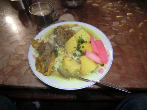 Yak-Curry mit Kartoffeln, Reis und Rettich, nebendran süßer Tee mit Yak-Butter